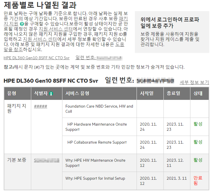 서버장비의 일련번호를 입력 후 제출을 클릭하면 아래와 같은 내용이 확인 됩니다.